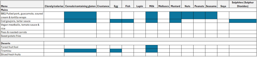 *More detailed allergen info is available at the hotel restaurant. This table has been supplied by the hotel as a guideline but please check with the hotel before consuming if you have dietary requirements or allergies.
